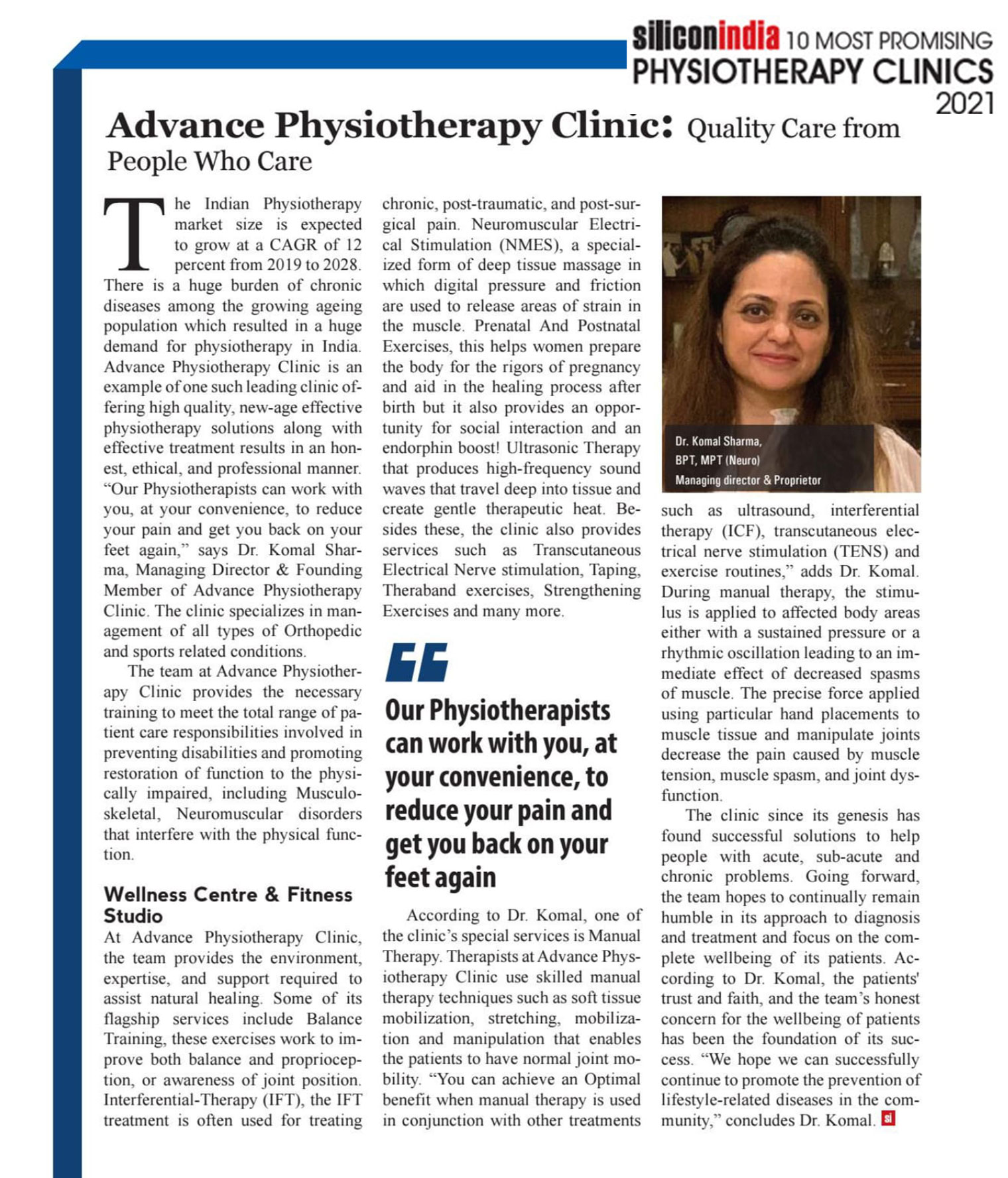 Advance Physiotherapy Clinic has one of the Best Physiotherapists for Physiotherapy treatment, situated in Pune providing systematic, organized, and professional rehabilitation services. Physiotherapy, or physical therapy, deals with the science of restoring physical function and mobility through manual therapy and exercise. We are committed to offering high-quality, new-age effective physiotherapy solutions along with effective treatment results in an honest, ethical, and professional manner. Our specialty includes the management of all types of Orthopedic and sports-related conditions. With today's mobile lifestyle, we often tend to ignore problems that make a movement or just going about in our life difficult. Our Physiotherapists can work with you, at your convenience, to reduce your pain and get you back on your feet again.